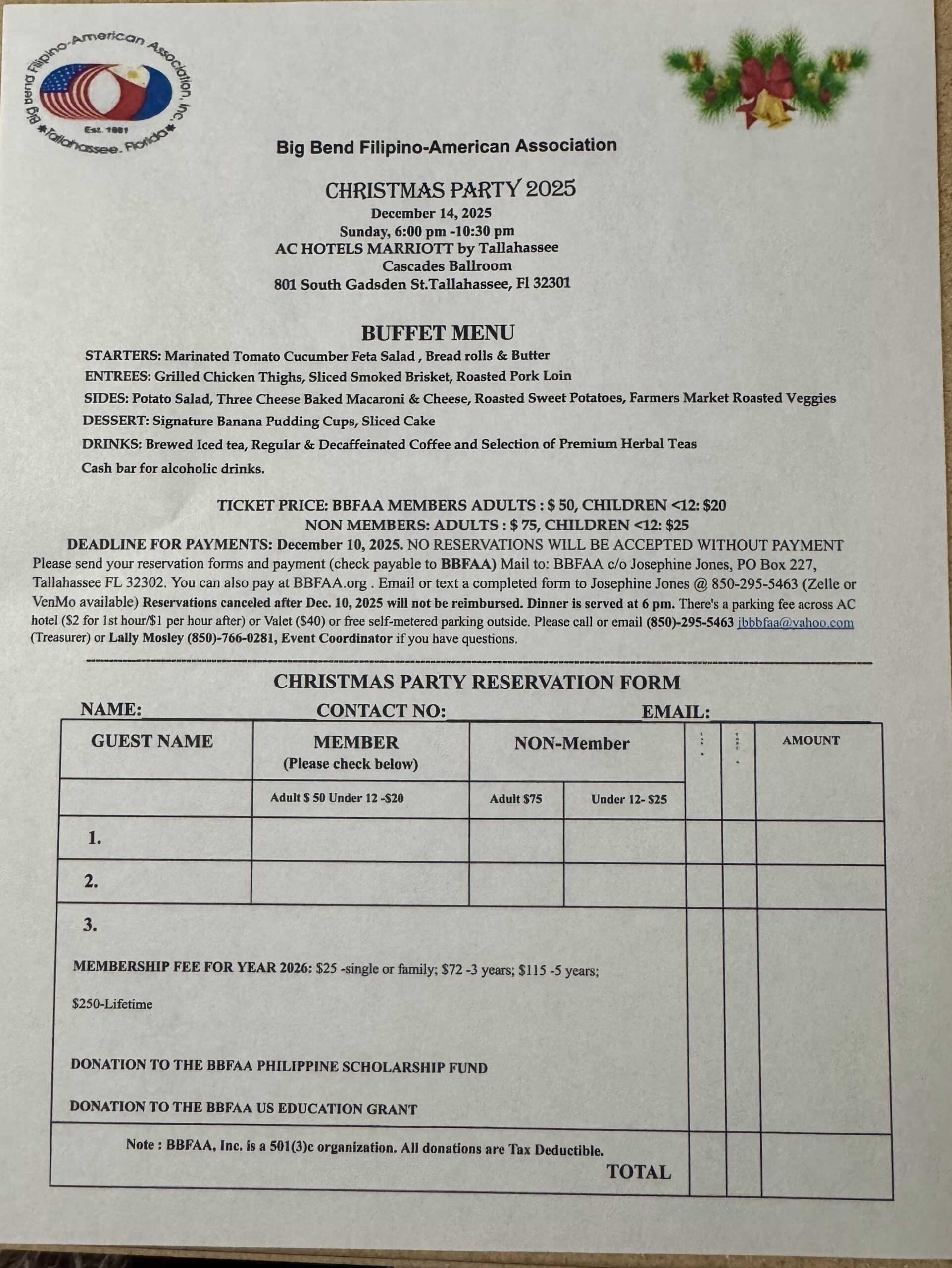 Details: Please join us for the BBFAA Annual Christmas Party. Cost: $52 for Adult Member, $78 Adult NonMember; $22 Children Member; $27 for Children Nonmember. Deadline for Christmas Party Reservations is December 10, 2025. No reservations will be accepted without payment.